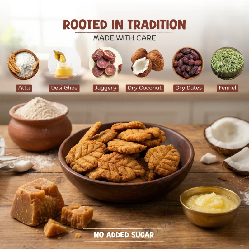 Whole wheat flour, pure desi ghee, natural jaggery, dry coconut, dates, and fennel - nothing more, nothing artificial